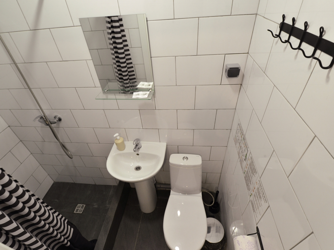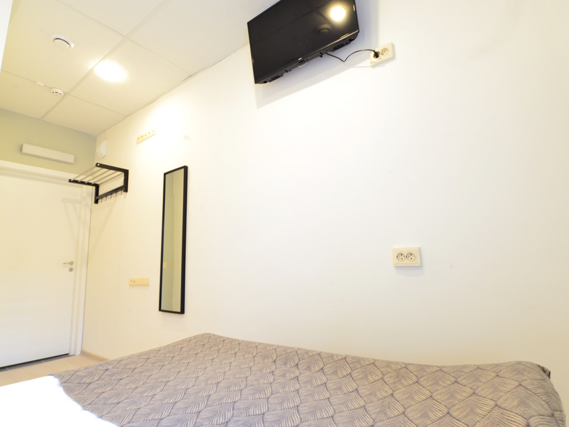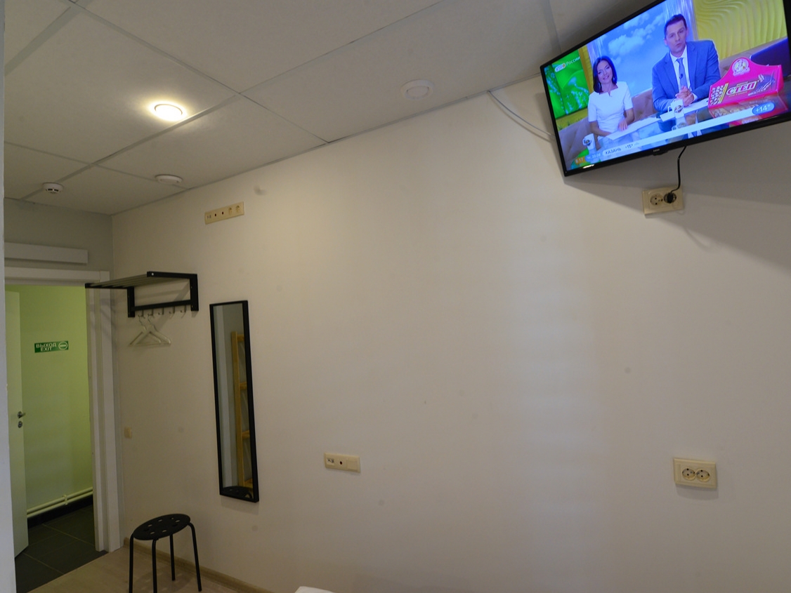 Стандартный однокомнатный номер. В номере: душ, туалет, ТВ, кондиционер. А также: столик, табуреты, зеркало.