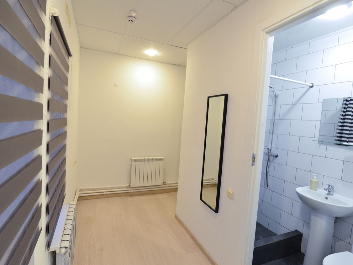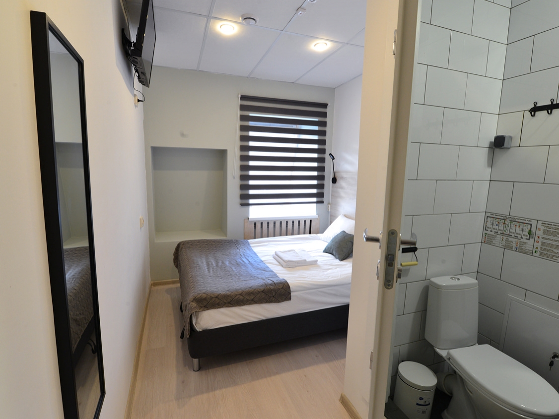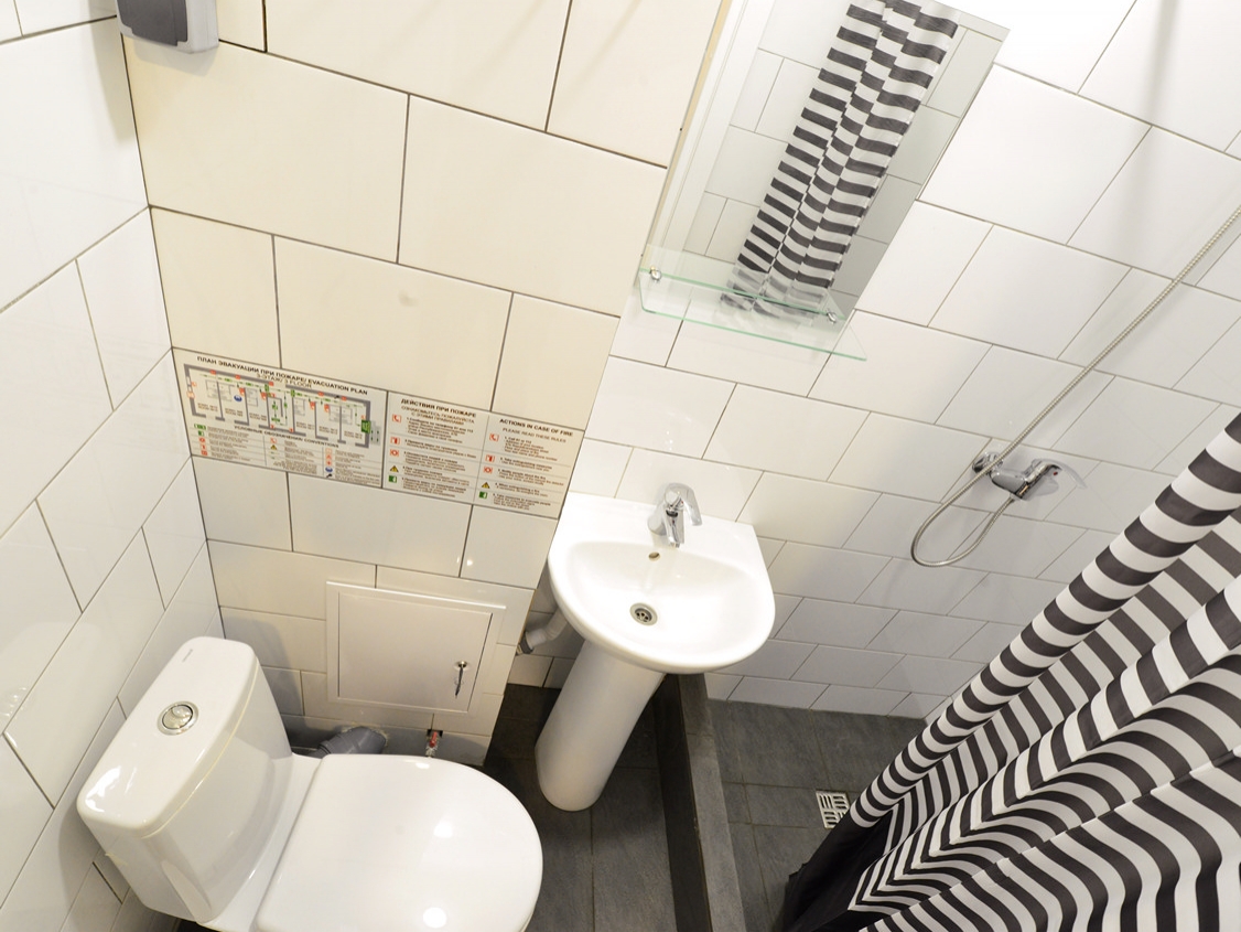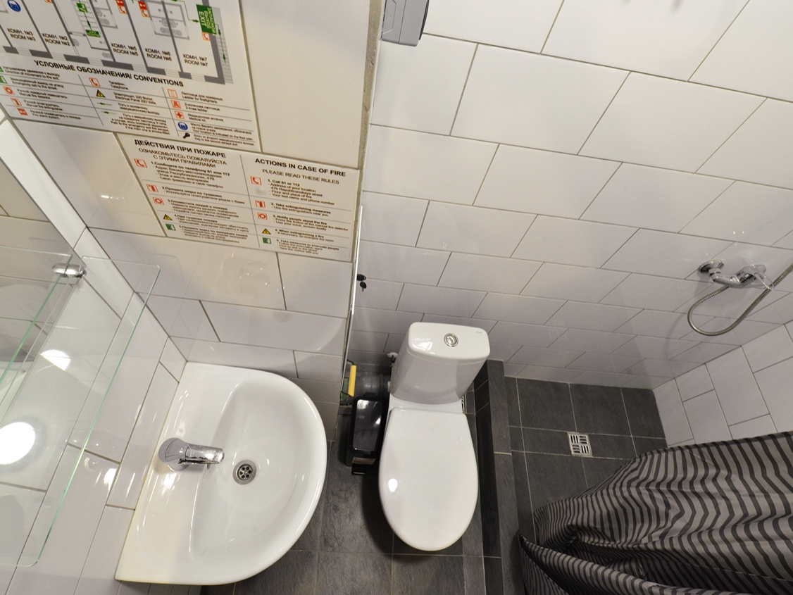 Стандартный однокомнатный номер. В номере: душ, туалет, ТВ, кондиционер. А также: столик, табуреты, зеркало.