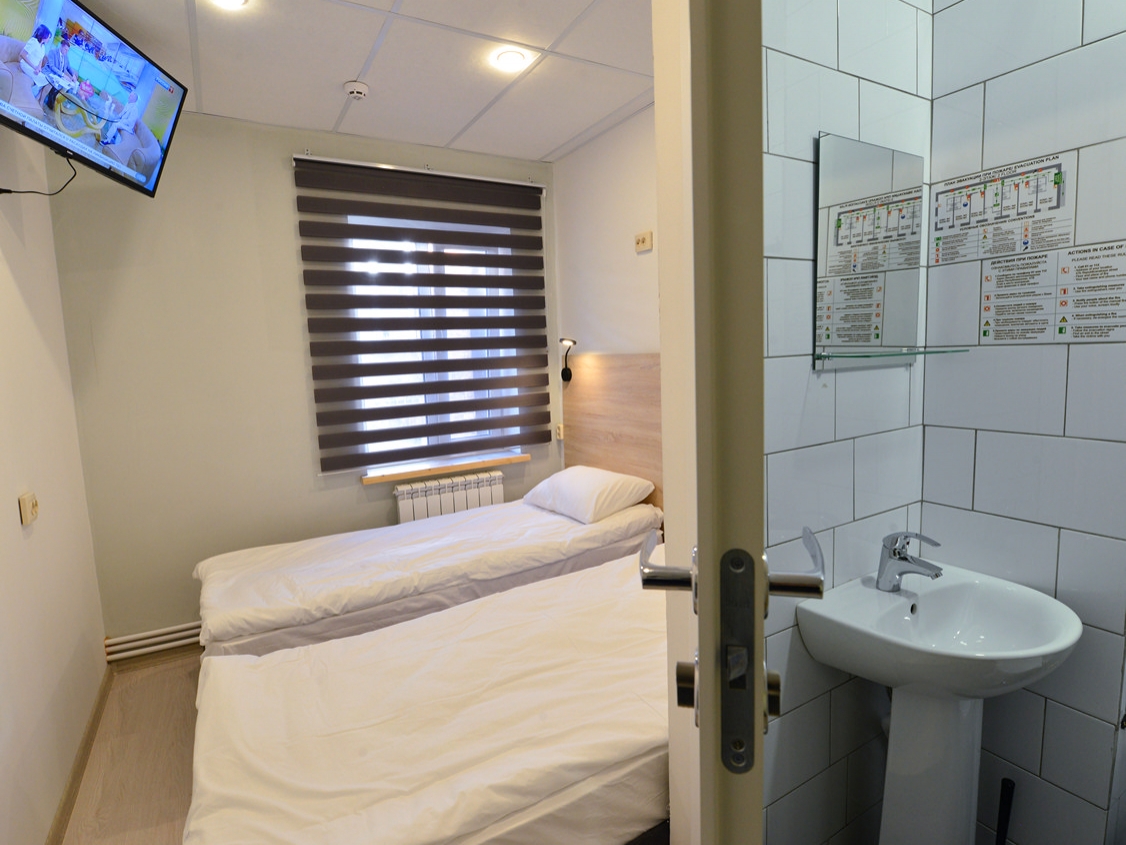 Стандартный однокомнатный номер. Две односпальные кровати и одно дополнительное место кресло-кровать. В номере: душ, туалет, ТВ, кондиционер. А также: столик, табуреты, зеркало.